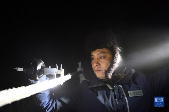 12月18日夜間,尹斌在110千伏西公線001號監(jiān)視哨所用游標卡尺測量導(dǎo)線覆冰厚度。