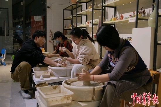 12月3日,北京市朝陽區(qū)一處建材城頂層,夜校陶藝課老師柴鑫杰(左一)在授課,當天課程的內(nèi)容是陶藝拉胚。中青報·中青網(wǎng)見習記者 田嘉碩/攝