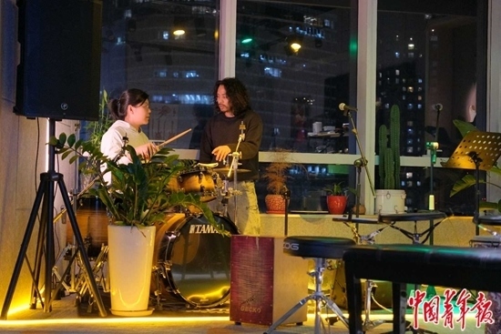 12月4日,北京市朝陽區(qū)望京的一處寫字樓里,夜校老師、樂隊鼓手老萬(右)在為一名學員講授架子鼓課程,她是一名零基礎(chǔ)學員。中青報·中青網(wǎng)見習記者 田嘉碩/攝