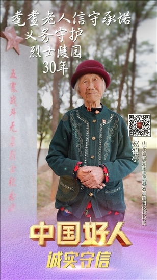 趙銀亭,女,1929年10月生,中共黨員,山東省濱州市惠民縣石廟鎮(zhèn)歸化村村民。趙銀亭是一位有75年黨齡的老黨員。1992年,當(dāng)?shù)亟⒘沂苛陥@,需要一位守陵人,63歲的趙銀亭主動(dòng)報(bào)了名。自此,她與丈夫搬到了距烈士陵園不過15米的舊屋居住。30多年來(lái),她堅(jiān)守信仰,守護(hù)烈士陵園,為前來(lái)參觀的人員講述英烈故事。