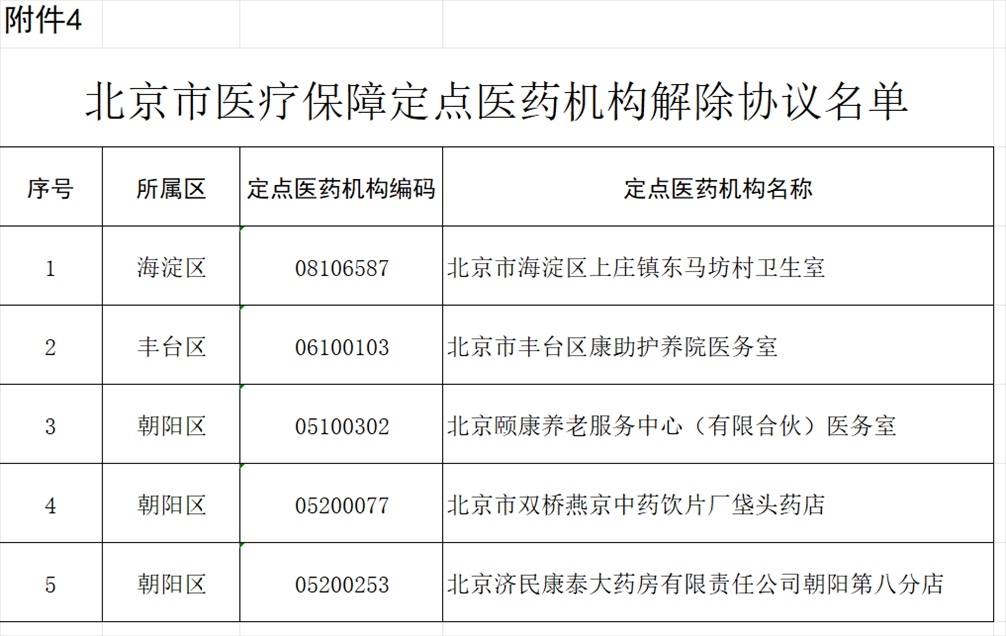北京市海淀區(qū)上莊鎮(zhèn)東馬坊村衛(wèi)生室等5家定點(diǎn)醫(yī)藥機(jī)構(gòu)因已注銷,申請(qǐng)解除協(xié)議。經(jīng)市、區(qū)醫(yī)保經(jīng)辦機(jī)構(gòu)審核,對(duì)上述5家定點(diǎn)醫(yī)藥機(jī)構(gòu)解除協(xié)議(見(jiàn)附件4)。