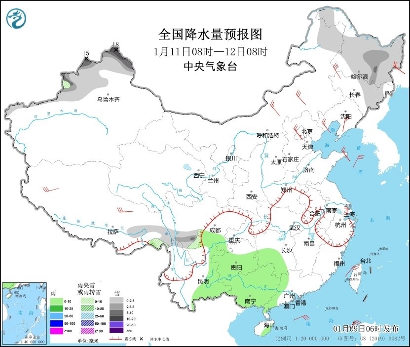1月11日08時(shí)至12日08時(shí),新疆北部、內(nèi)蒙古東北部、黑龍江、吉林東部、川西高原南部等地的部分地區(qū)有小到中雪或雨夾雪,其中新疆阿勒泰、塔城、伊犁河谷等地的部分地區(qū)有大雪,局地暴雪(10~18毫米);四川南部、湖南西南部、貴州、云南東部、廣西等地的部分地區(qū)有小雨。內(nèi)蒙古中東部、東北地區(qū)南部、華北東部、山東半島、西藏等地的部分地區(qū)有4~6級風(fēng);黃海北部、臺灣海峽、臺灣以東洋面、巴士海峽、南海東北部和西南部等海域有6~7級風(fēng)、陣風(fēng)8~9級(見圖3)。
