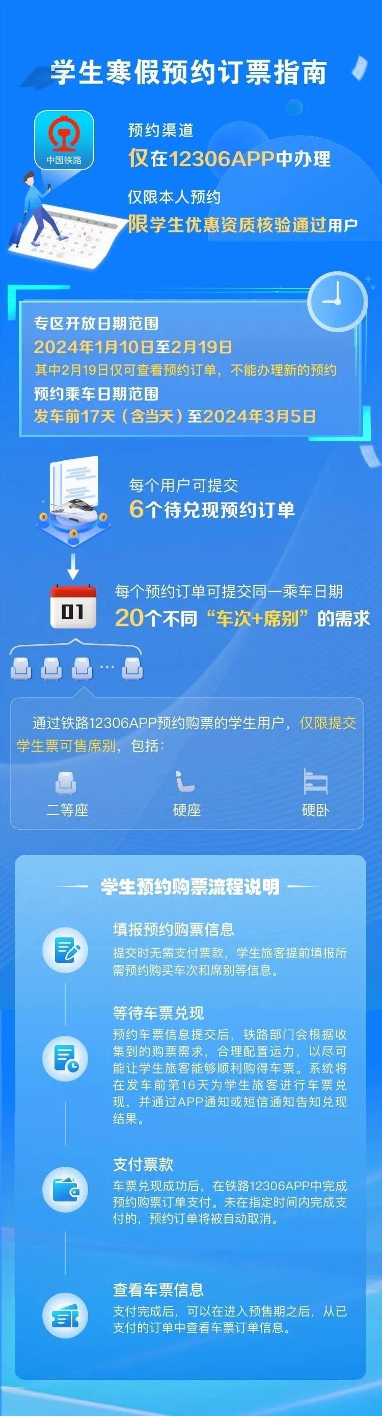 為認(rèn)真貫徹落實黨中央國務(wù)院關(guān)于做好2024年元旦春節(jié)期間有關(guān)工作的要求,保障學(xué)生、務(wù)工人員等重點群體春運(yùn)出行,鐵路12306創(chuàng)新服務(wù)舉措,為學(xué)生、務(wù)工人員推出了售票服務(wù)專區(qū)。自1月10日起,符合條件的學(xué)生旅客(已通過學(xué)生優(yōu)惠資質(zhì)核驗且有剩余優(yōu)惠乘車次數(shù))可通過“學(xué)生寒假訂票專項服務(wù)”專區(qū)預(yù)約購買春運(yùn)期間(1月26日至3月5日)火車票,每名旅客最多可同時提交6個預(yù)約訂單,每個訂單可添加1個乘車日期的20個“車次+席別”的組合,可選席別為學(xué)生優(yōu)惠票適用的硬座、硬臥、二等座。已通過實名制核驗的務(wù)工人員可通過“務(wù)工人員春運(yùn)預(yù)約訂票服務(wù)”專區(qū)預(yù)約購買春運(yùn)期間火車票,每名旅客可同時提交6個預(yù)約訂單,每個訂單可選擇“時間+車次+席別”的1個組合。