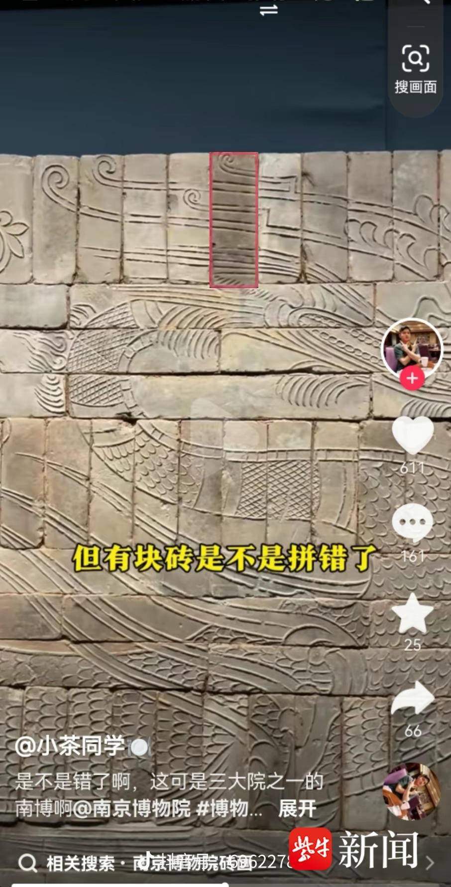 “家人們,我好像在南博發(fā)現(xiàn)了一件展品有一處錯(cuò)誤”,網(wǎng)友“小茶同學(xué)”發(fā)視頻表示,“1月25日去南京博物院游覽,在看到《羽人戲龍磚畫》時(shí),發(fā)現(xiàn)磚畫很精美,保留很完整。磚畫上的陽(yáng)刻線條尤其讓我感到震撼,看到深色磚的部分,我感覺有點(diǎn)別扭,當(dāng)時(shí)就臆想著那塊磚反過來是不是更好一點(diǎn),于是發(fā)了一個(gè)視頻求助?!?/p>