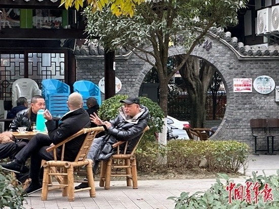 成都青羊區(qū)清波社區(qū),居民們?cè)诓桊^聊天。