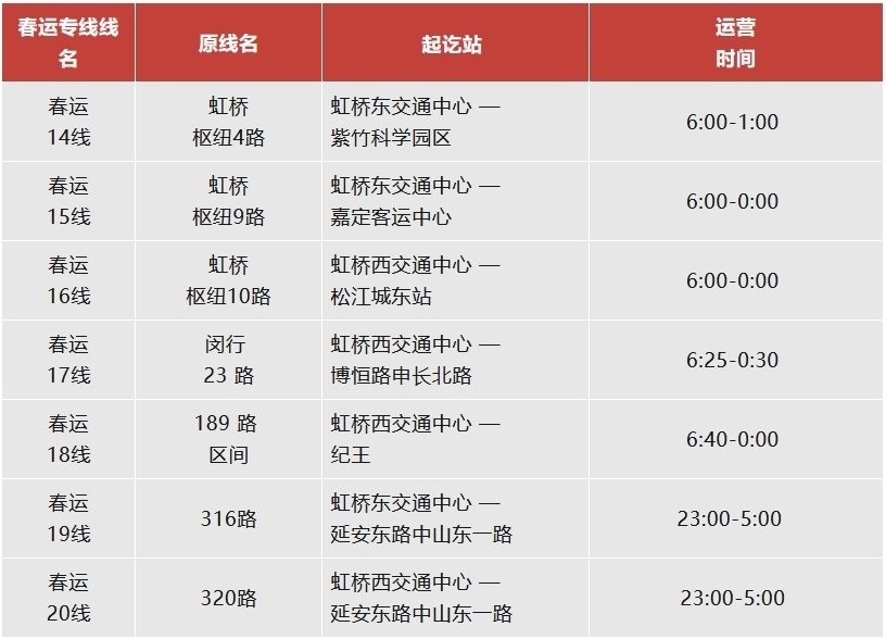 注:虹橋樞紐春運(yùn)專(zhuān)線(xiàn)運(yùn)營(yíng)日期為2月14日至3月5日。