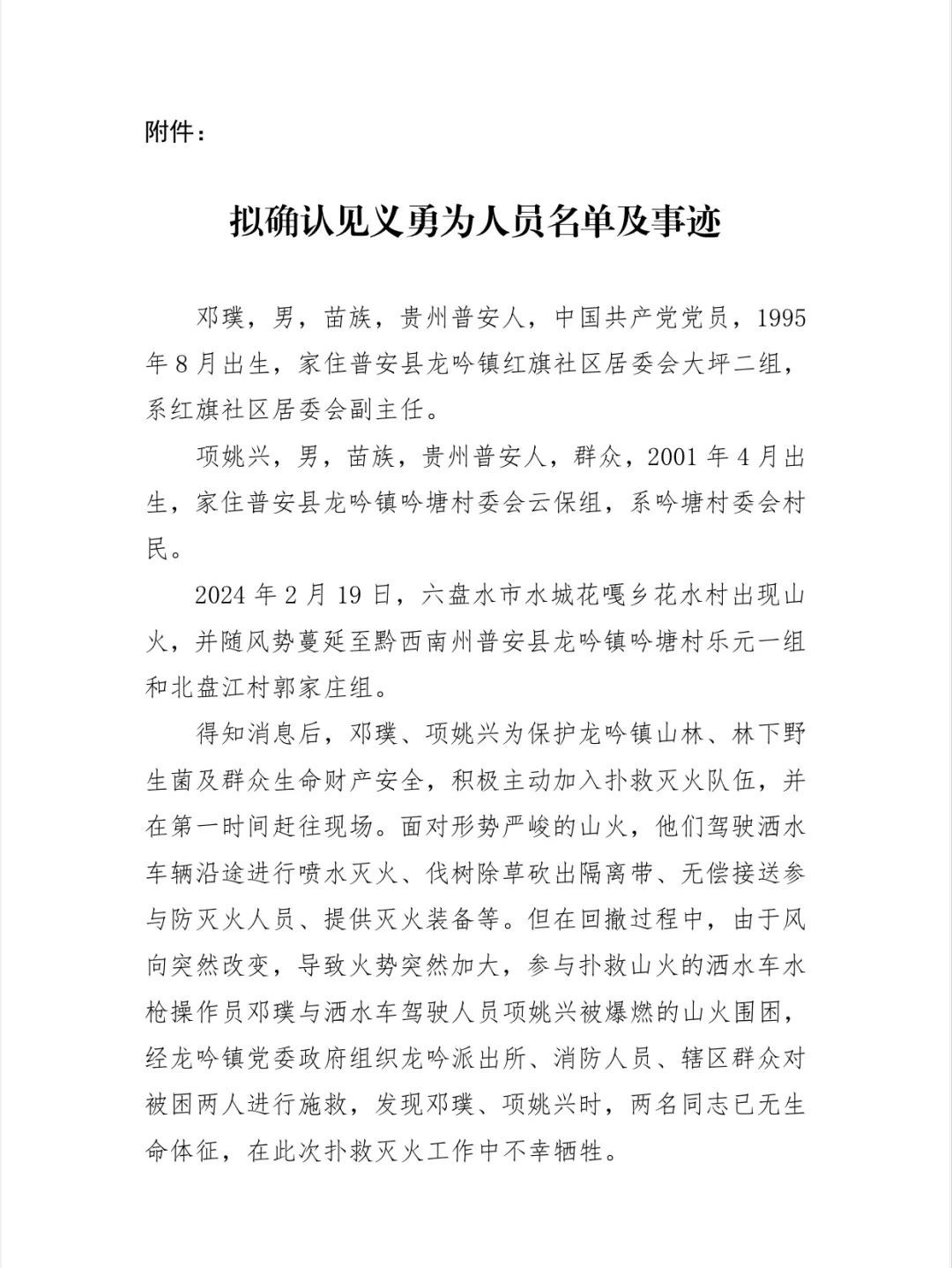 2月23日,普安縣委政法委發(fā)布公示,擬確認犧牲的鄧璞(1995年8月出生,紅旗社區(qū)居委會副主任)、項姚興(2001年4月出生,吟塘村委會村民)為見義勇為人員。