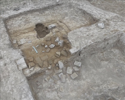 此外,考古隊(duì)員在最大的房址發(fā)現(xiàn)方形磚砌祭臺(tái)。專家表示,磚砌祭臺(tái)屬熱水墓群中的首次發(fā)現(xiàn),祭臺(tái)中發(fā)現(xiàn)大量磚塊。通過陵園及祭祀建筑的規(guī)模、數(shù)量等線索推測(cè),這個(gè)墓葬的規(guī)格、墓主人的身份等級(jí)要高于2018血渭一號(hào)墓。
