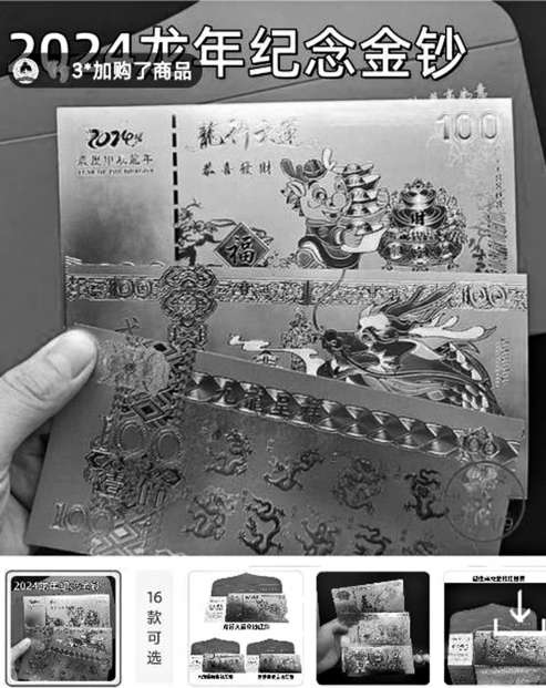一些直播間里,正在兜售“足金”“足銀”類的龍年紀念鈔。這些紀念鈔,乍一看外形與錢幣相差不大,在金銀材質的襯托下顯得很高大上。記者發(fā)現(xiàn),這些“紀念鈔”售價通常比券面所標數(shù)字低上一兩元,例如標著100的,多售價98元、99元。
