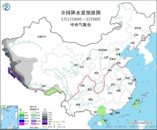 全國降水量預(yù)報圖(3月2日08時-3日08時)