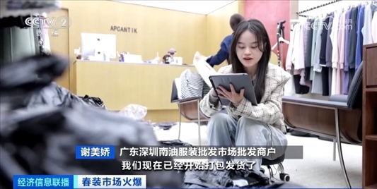 深圳另一家服裝工廠里,一批批春裝整齊地堆放在車間,正等著最后的包裝發(fā)貨。這兩天,這些春裝將發(fā)往全國(guó)各地。朱以做服裝批發(fā)已經(jīng)有九個(gè)年頭,他表示,目前的訂單同比增長(zhǎng)超3倍,工廠訂單排期已經(jīng)到了兩個(gè)月后,最近工廠也在不斷招人提升產(chǎn)能。