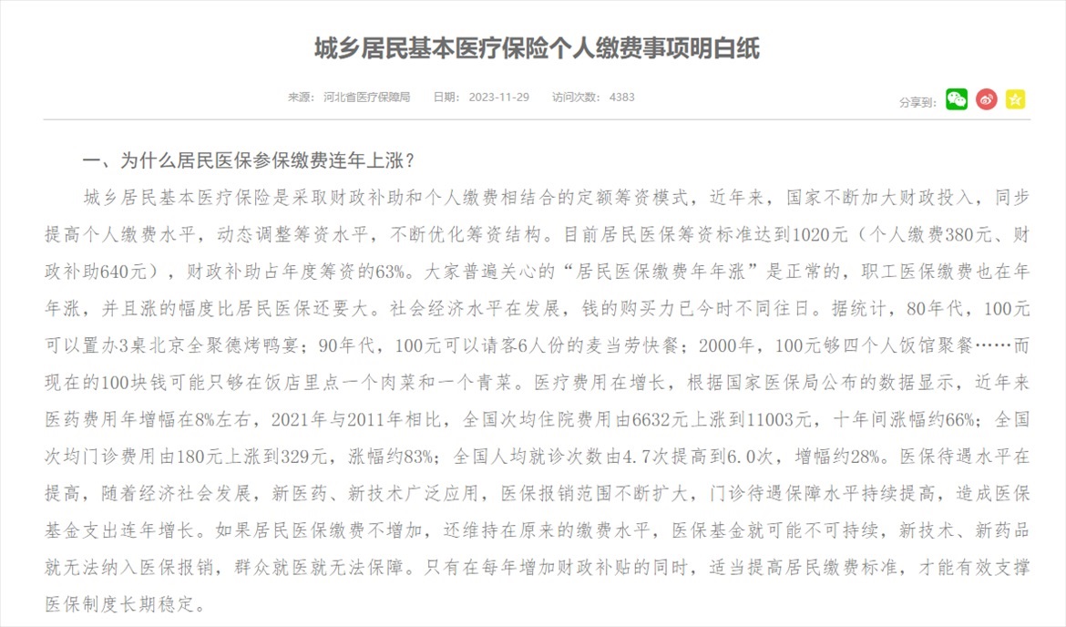 《城鄉(xiāng)居民基本醫(yī)療保險個人繳費事項明白紙》(央廣網(wǎng)發(fā) 河北省醫(yī)保局官網(wǎng))