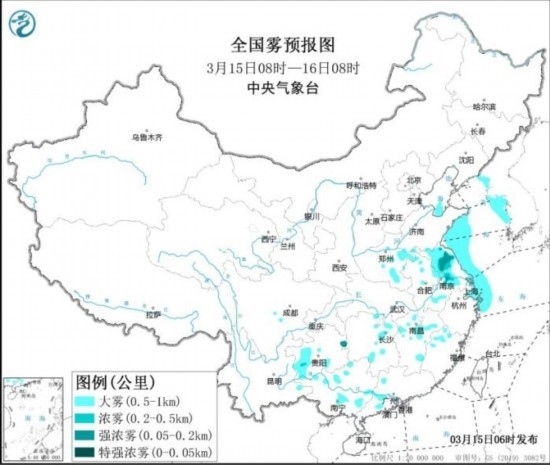 15日白天至夜間,渤海灣、黃海西部和東北部海域、東海西北部海域、山東東部沿岸海域、江蘇沿岸海域、長江口附近海域、杭州灣附近海域?qū)⒂心芤姸炔蛔?公里的大霧。此外,15日早晨至上午,江蘇大部、河南東部、貴州西部、湖南東部、江西北部等地的部分地區(qū)有大霧,局地有能見度不足200米的強濃霧。中央氣象臺3月15日06時發(fā)布大霧黃色預警。
