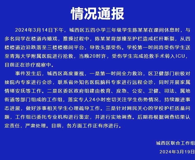央視網消息:據“魅力西區(qū)”微信公眾號消息,城西區(qū)聯合工作組通報,3月14日下午,城西區(qū)五四小學三年級學生陳某某在課間休息時,與多名同學在樓道內嬉戲,推搡過程中,陳某某背部撞至護欄造成欄桿斷裂,從四樓樓道邊沿跌落至三樓樓梯間平臺,導致頭部受傷。學校第一時間將受傷學生送至青海大學附屬醫(yī)院進行搶救,當晚20時許,受傷學生完成搶救手術轉入ICU,目前正在診療觀察中。