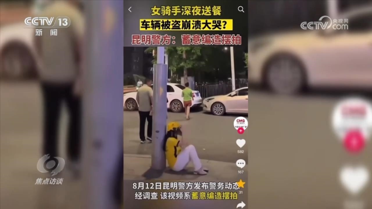 2023年8月3日,某網(wǎng)絡(luò)平臺(tái)發(fā)布了一個(gè)短視頻,除了哭泣聲,上面文字打的是“深夜,外賣姐姐送餐,下樓發(fā)現(xiàn)車被偷了”。然而,就是這樣一個(gè)時(shí)長僅10秒左右的視頻,當(dāng)晚瀏覽量已超6000萬次,并在多個(gè)平臺(tái)迅速傳播,進(jìn)入熱榜,隨即點(diǎn)贊、收藏量超過10萬次。同樣,這些也引起了警方的關(guān)注,經(jīng)調(diào)查核實(shí),該視頻為擺拍,發(fā)布者就是畫面中表演的女子,其丈夫在旁負(fù)責(zé)道具和指導(dǎo)。而他們當(dāng)時(shí)擺拍的全過程被大街上的戶外監(jiān)控記錄了下來。