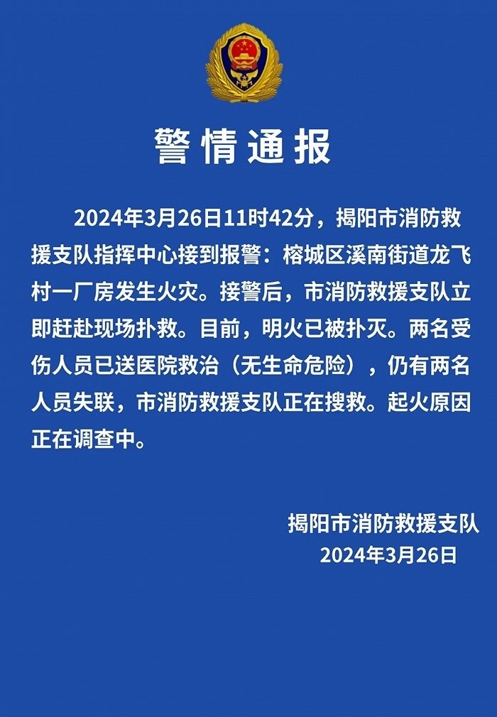 央視網消息:據“揭陽發(fā)布”微信公眾號消息,揭陽市消防救援支隊發(fā)布警情通報,2024年3月26日11時42分,揭陽市消防救援支隊指揮中心接到報警:榕城區(qū)溪南街道龍飛村一廠房發(fā)生火災。接警后,市消防救援支隊立即趕赴現場撲救。目前,明火已被撲滅。兩名受傷人員已送醫(yī)院救治(無生命危險),仍有兩名人員失聯,市消防救援支隊正在搜救。起火原因正在調查中。