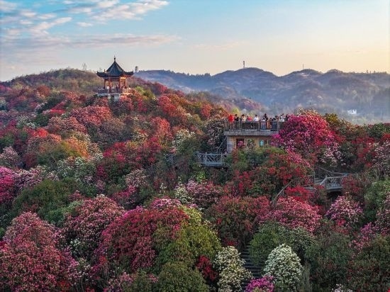 貴州烏蒙山區(qū),百里杜鵑景區(qū)的野生杜鵑花相繼綻放,如同一條彩帶飄舞山間,這里有面積大、種類(lèi)多、保存完好的原始杜鵑林。景區(qū)管理單位舉行了祭花神等豐富的民俗活動(dòng)。