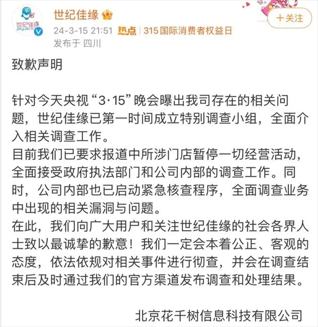 值得一提的是,今年央視3·15晚會曝光珍愛網(wǎng)、世紀(jì)佳緣、戀愛課等多家婚戀平臺涉嫌用優(yōu)質(zhì)的異性資源、0門檻的誘人廣告、言之鑿鑿的成功案例作為噱頭,欺騙消費者。對此,世紀(jì)佳緣致歉稱,第一時間成立特別調(diào)查小組,全面介入相關(guān)調(diào)查工作。目前公司已要求報道中所涉門店暫停一切經(jīng)營活動,全面接受政府執(zhí)法部門和公司內(nèi)部的調(diào)查工作。同時,公司內(nèi)部也已啟動緊急核查程序,全面調(diào)查業(yè)務(wù)中出現(xiàn)的相關(guān)漏洞與問題。珍愛網(wǎng)官方微博發(fā)布致歉聲明,稱在第一時間成立專項小組,采取最嚴(yán)措施,全面深入調(diào)查并立即處理相關(guān)問題。