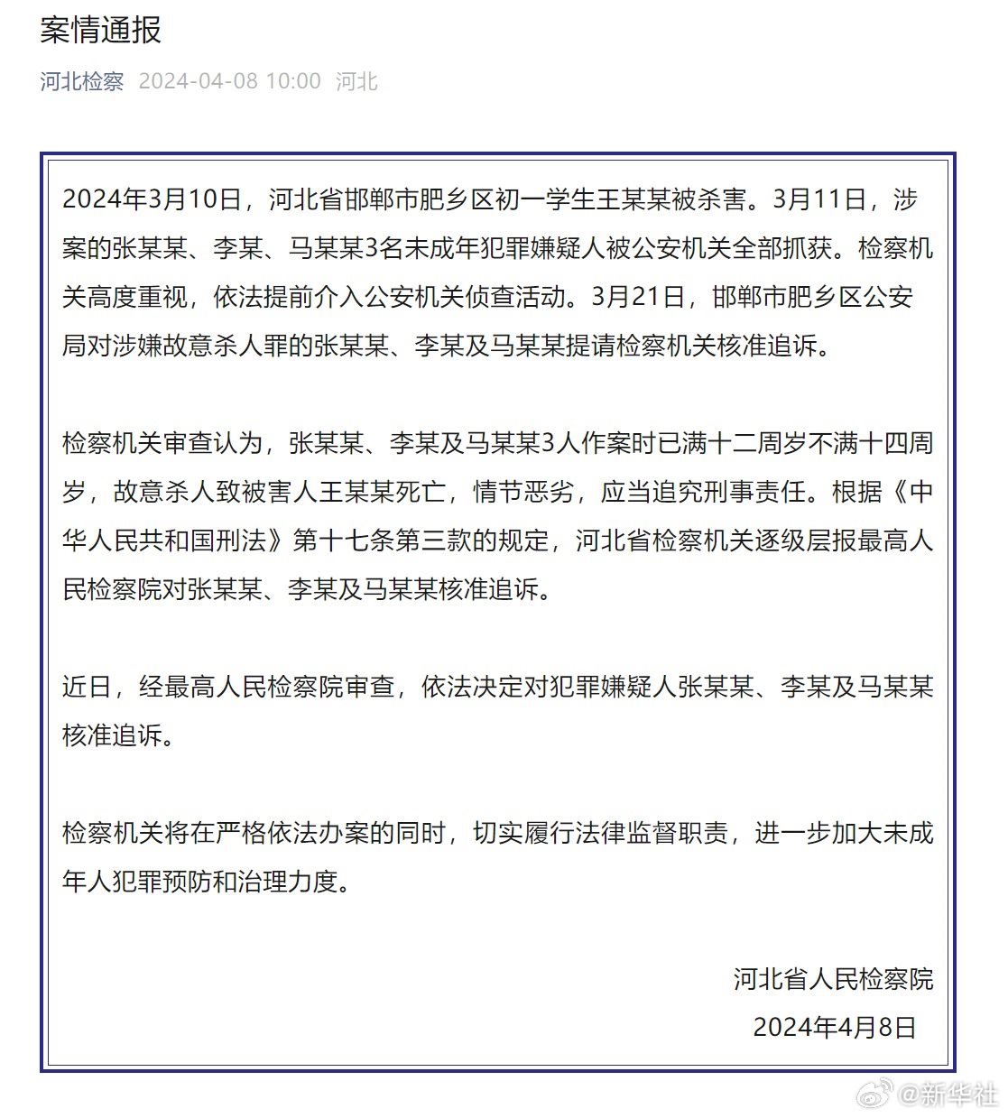 2024年3月10日,河北省邯鄲市肥鄉(xiāng)區(qū)初一學(xué)生王某某被殺害。3月11日,涉案的張某某、李某、馬某某3名未成年犯罪嫌疑人被公安機(jī)關(guān)全部抓獲。檢察機(jī)關(guān)高度重視,依法提前介入公安機(jī)關(guān)偵查活動(dòng)。3月21日,邯鄲市肥鄉(xiāng)區(qū)公安局對(duì)涉嫌故意殺人罪的張某某、李某及馬某某提請檢察機(jī)關(guān)核準(zhǔn)追訴。