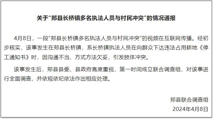 央視網(wǎng)消息:據(jù)“郟縣發(fā)布”公眾號消息,河南省平頂山市郟縣聯(lián)合調(diào)查組發(fā)布情況通報,4月8日,一段“郟縣長橋鎮(zhèn)多名執(zhí)法人員與村民沖突”的視頻在互聯(lián)網(wǎng)傳播。經(jīng)初步核實(shí),該事發(fā)生在郟縣長橋鎮(zhèn),系長橋鎮(zhèn)執(zhí)法人員在向群眾下達(dá)違法占用耕地《停工通知書》時,因溝通不當(dāng)、方式方法欠妥,引發(fā)肢體沖突。