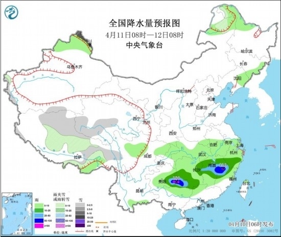 4月11日08時至12日08時,內(nèi)蒙古東北部、西藏中東部、青海南部、新疆北疆北部等地部分地區(qū)有小到中雪或雨夾雪,其中,新疆北疆北部和北疆東部等地部分地區(qū)有大到暴雪,局地大暴雪(20~24毫米)。貴州東南部、湖南中南部、江西中北部、浙江南部、福建北部、廣西北部等地部分地區(qū)有中到大雨,其中,貴州東南部、湖南西南部、江西東部、福建西北部、廣西東北部等地部分地區(qū)有暴雨或大暴雨(100~180毫米)。內(nèi)蒙古中部、遼東半島、山東半島、浙江北部等地部分地區(qū)有4~5級風(fēng);渤海、渤海海峽、黃海大部海域部分海域?qū)⒂?~7級、陣風(fēng)8級的風(fēng)。