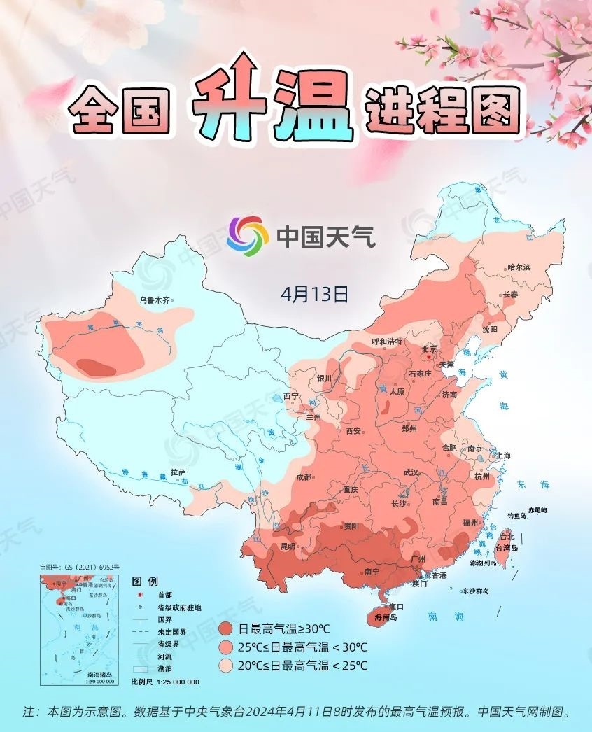 眼下,全國大部處于冷空氣影響間歇期,升溫是主旋律。預(yù)計今起三天(4月11日至13日),我國從北到南都將開啟回暖進程,最高氣溫25℃以上的區(qū)域幾乎覆蓋整個中東部,波及20余省份,東北、西北地區(qū)氣溫將大面積創(chuàng)今年以來新高,北方不少地方還會體驗到常年5月中旬才有的超前暖熱。中國天氣網(wǎng)推出全國升溫進程圖,看看哪些地方將沖擊30℃。