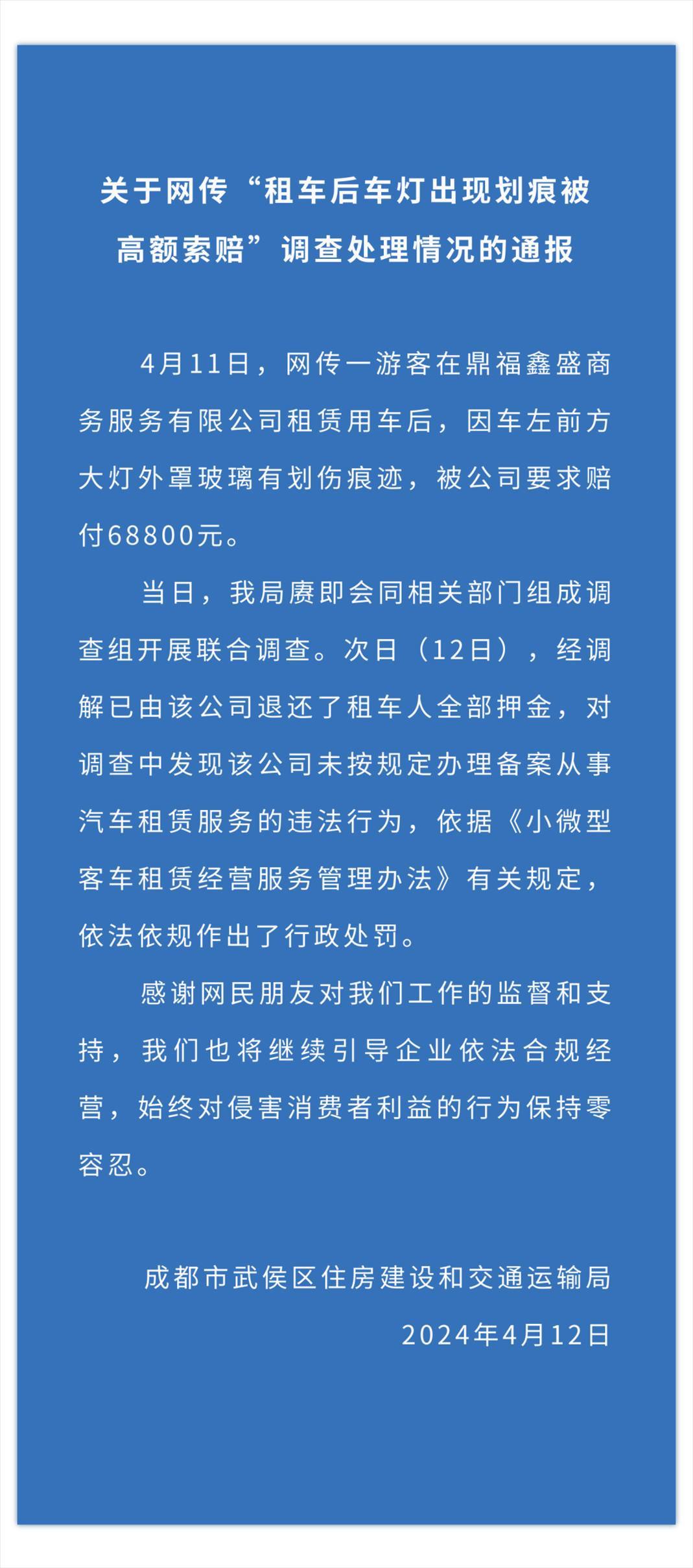 央視網(wǎng)消息:成都市武侯區(qū)住房建設(shè)和交通運(yùn)輸局4月12日晚發(fā)布通報(bào),4月11日,網(wǎng)傳一游客在鼎福鑫盛商務(wù)服務(wù)有限公司租賃用車(chē)后,因車(chē)左前方大燈外罩玻璃有劃傷痕跡,被公司要求賠付68800元。當(dāng)日,我局賡即會(huì)同相關(guān)部門(mén)組成調(diào)查組開(kāi)展聯(lián)合調(diào)查。次日(12日),經(jīng)調(diào)解已由該公司退還了租車(chē)人全部押金,對(duì)調(diào)查中發(fā)現(xiàn)該公司未按規(guī)定辦理備案從事汽車(chē)租賃服務(wù)的違法行為,依據(jù)《小微型客車(chē)租賃經(jīng)營(yíng)服務(wù)管理辦法》有關(guān)規(guī)定,依法依規(guī)作出了行政處罰。