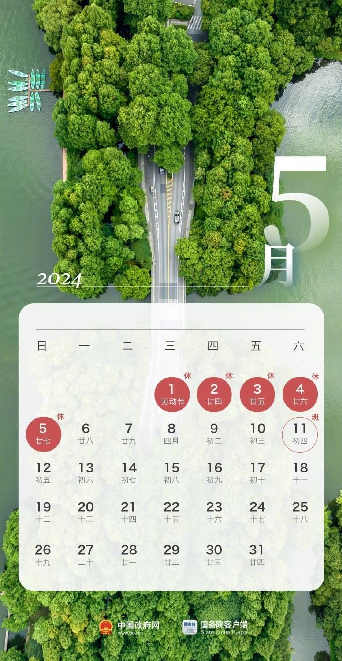 根據(jù)國務院辦公廳通知精神,2024年勞動節(jié)放假安排為:5月1日(星期三)至5月5日(星期日)放假調(diào)休,共5天。4月28日(星期日)、5月11日(星期六)上班。