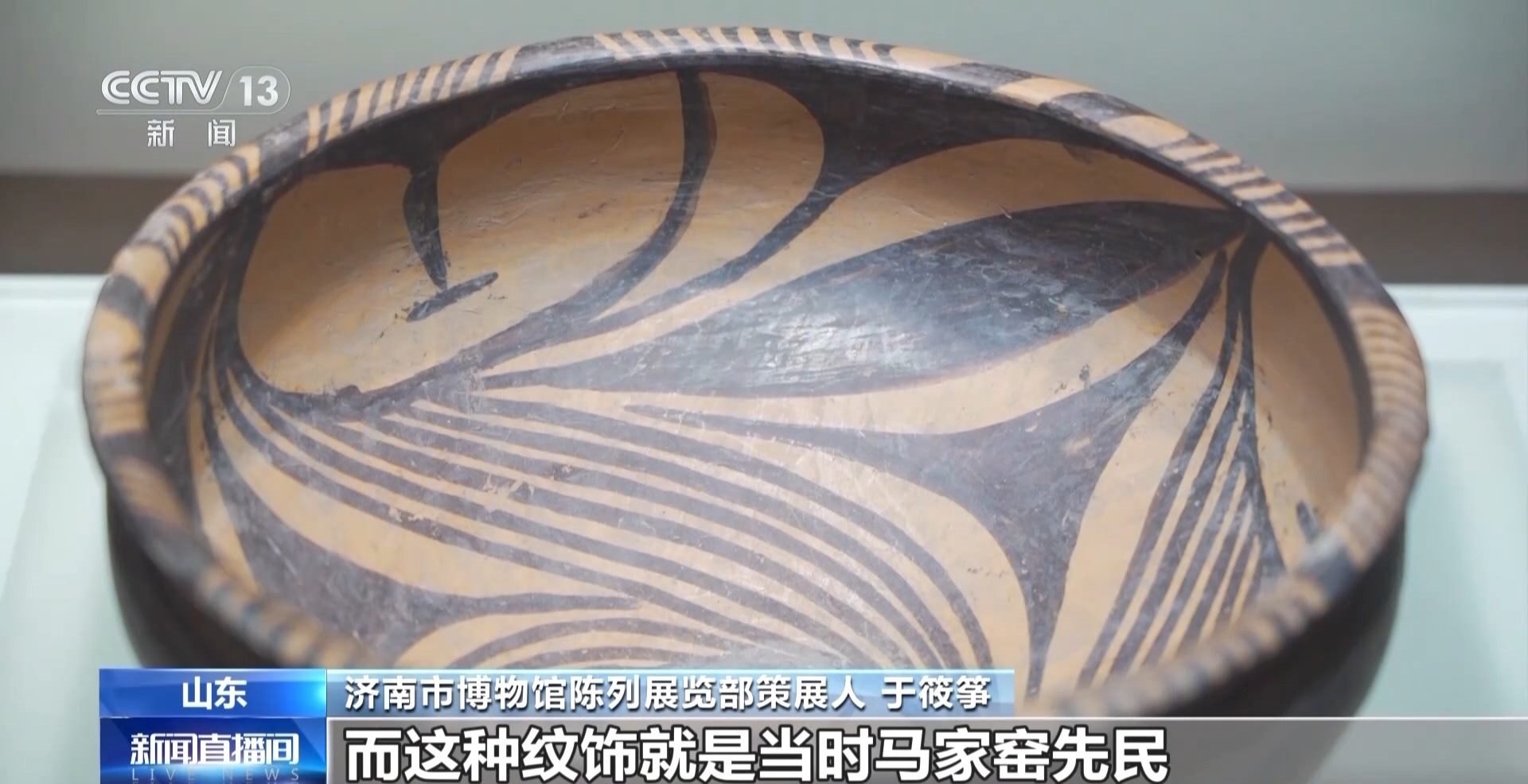 濟(jì)南市博物館陳列展覽部策展人 于筱箏:例如我們此次展覽中展出的兩件非常重要的漩渦紋彩陶壺和漩渦紋彩陶盆,其上均是以漩渦紋為主要紋飾,而這種紋飾就是當(dāng)時馬家窯先民對于黃河奔騰河水的一種非常概括,以及極富想象力的描繪,它們也是新石器時代晚期黃河文明形成與發(fā)展的一種重要見證。
