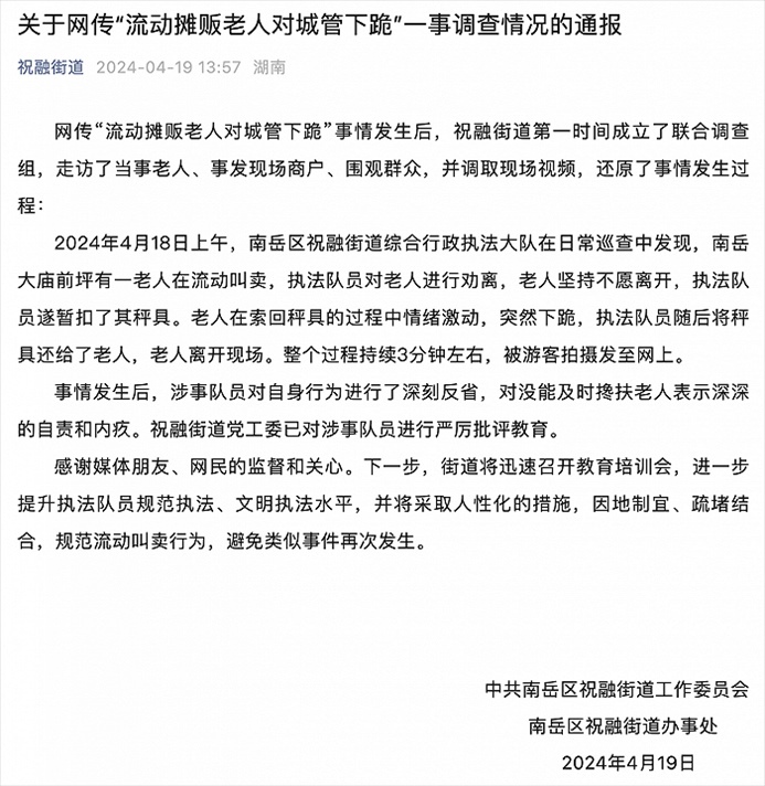 央視網(wǎng)消息:4月19日,衡陽南岳區(qū)祝融街道辦事處發(fā)布關(guān)于網(wǎng)傳“流動攤販老人對城管下跪”一事調(diào)查情況的通報。