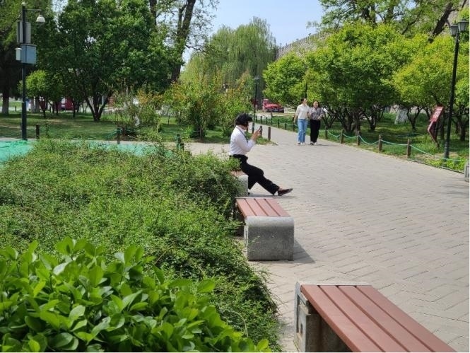 轉(zhuǎn)過(guò)北京城東南角樓,有一片休息區(qū),一位穿著襯衫西褲的女子獨(dú)自坐在公共座椅上,專注地看著手機(jī),神情放松自然。13時(shí)20分,她站起身,拍拍黑色西褲上的灰塵,伸了個(gè)懶腰,快步離開(kāi)了公園區(qū)域,往寫(xiě)字樓的方向走去。
