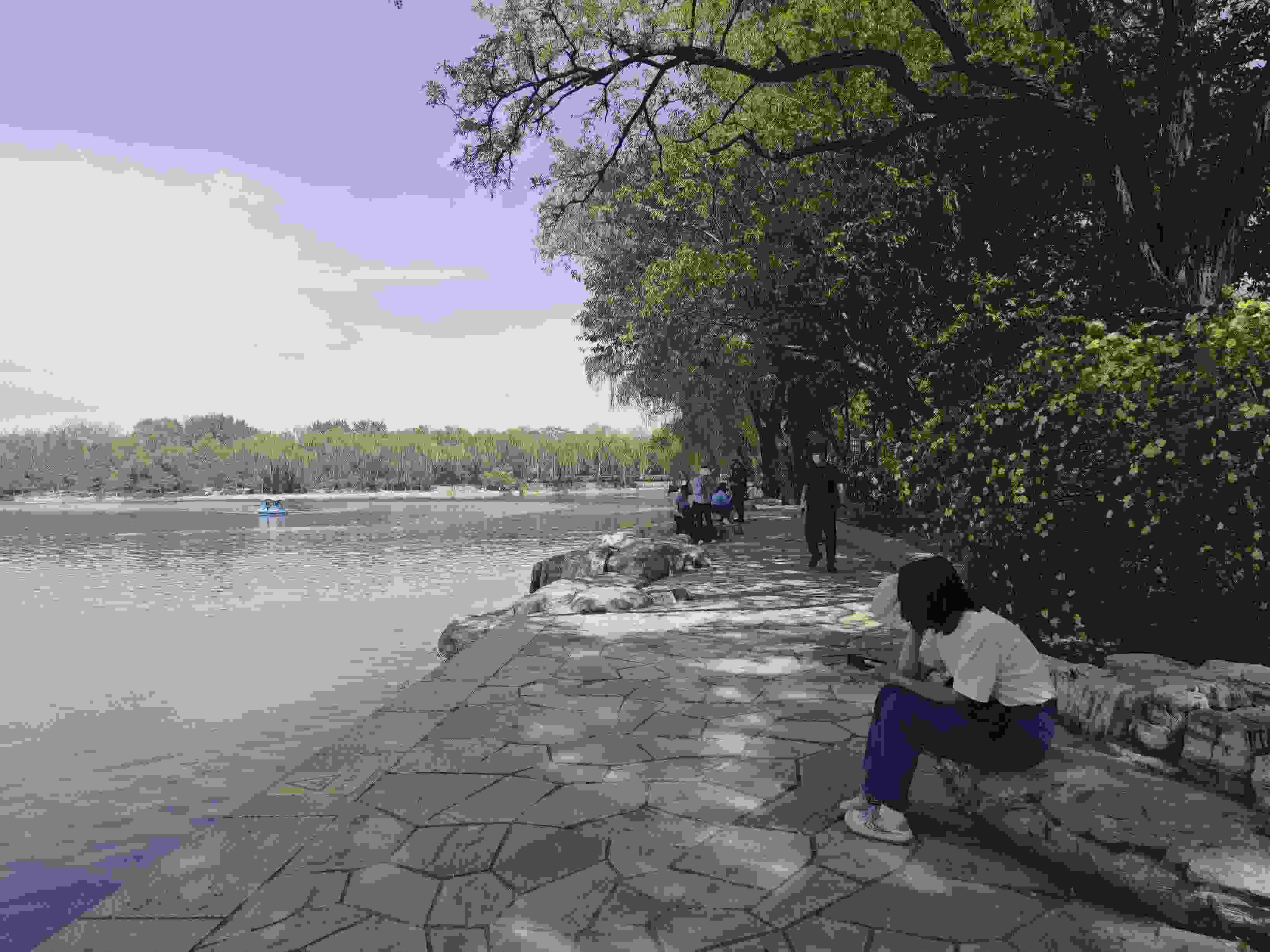 工作日午休時(shí)分的玉淵潭公園,也成了上班族的精神“快充站”。玉淵潭公園東湖旁,一排年輕人正悠閑地曬著太陽(yáng)。眼前的湖面開(kāi)闊平靜,微風(fēng)拂面,頭頂垂柳依依,耳邊不時(shí)傳來(lái)清脆的鳥(niǎo)鳴聲。