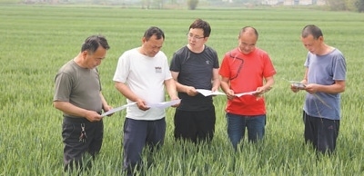 蘇丹(中)在指導(dǎo)村民進(jìn)行小麥揚花期田間管理。本報記者 原韜雄攝