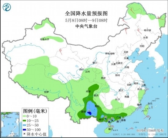 全國降水量預(yù)報(bào)圖(5月8日08時-9日08時)