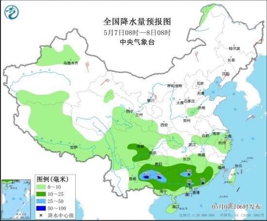 全國降水量預(yù)報(bào)圖(5月7日08時-8日08時)