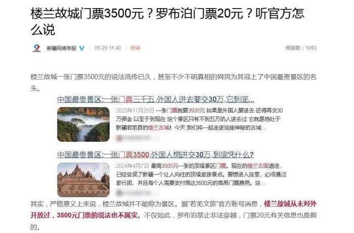 文章稱, ?樓蘭故城一張門票3500元的說法流傳已久,甚至不少不明真相的網(wǎng)民為其冠上了中國最貴景區(qū)的名頭。其實(shí),嚴(yán)格意義上來說,樓蘭故城并不能稱為景區(qū)。據(jù)“若羌文旅”官方賬號(hào)消息,樓蘭故城從未對外開放過,3500元門票的說法也不屬實(shí)。不僅如此,羅布泊禁止非法穿越,門票20元有關(guān)信息也是假的。