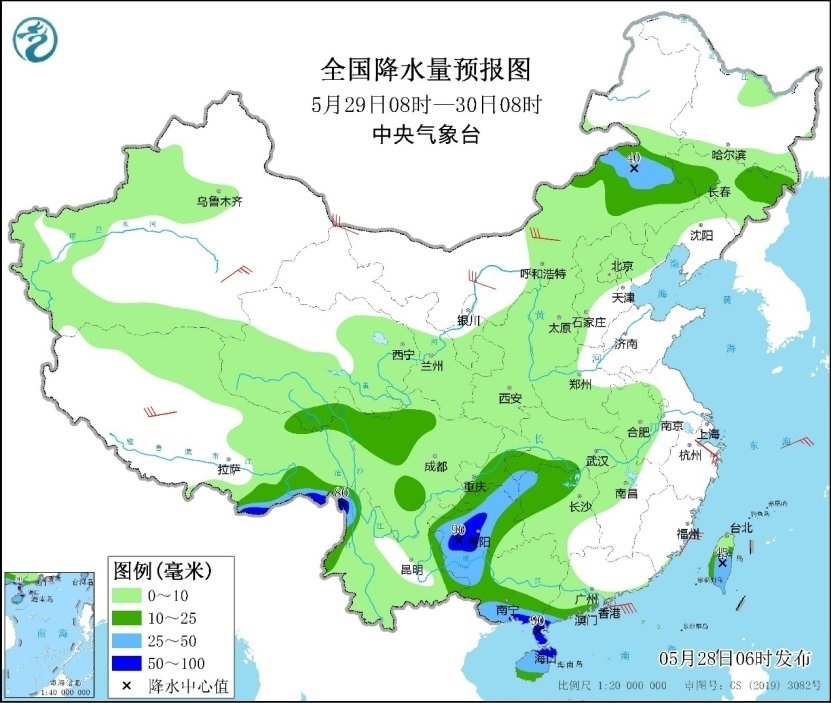 人民網(wǎng)北京5月28日電 (溫璐、高清揚)據(jù)中央氣象臺網(wǎng)站消息,昨日,較強降水主要出現(xiàn)在江南中東部、華南及西南地區(qū)東南部等地,其中,安徽銅陵,浙江金華和衢州,福建南平,廣東江門和茂名,廣西玉林、崇左、百色和南寧,云南文山等局地出現(xiàn)大暴雨。預(yù)計今明兩天,南方地區(qū)強降水范圍收縮,暴雨預(yù)警今晨已降級為藍(lán)色,但華南南部、西南地區(qū)東部等地部分地區(qū)仍雨勢較強,公眾需關(guān)注持續(xù)降雨對交通出行的不利影響,注意出行安全。