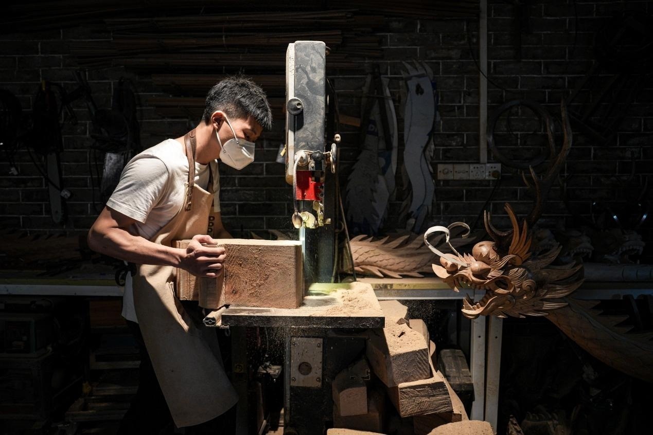 張偉潮身上的傷也沒斷過?!疤焯旄洞蚪坏?,有時(shí)候傷口剛縫了線,回到家一干活,刀口又開了”,手臂上、手背上遍布的傷疤,見證了每一個(gè)龍頭的誕生?!懊肯乱坏?,我都已經(jīng)想好了后面的第二步、第三步”,龍頭雕刻極為考究,從選料、切割,到粗雕、精雕,再到打磨、拋光、裱漆,十幾道繁瑣工序,全靠師傅的眼光和手藝。機(jī)械化、流水線,做不出龍頭嗎?在數(shù)不清的日夜里,光影斑駁間,張偉潮拿著父輩傳下的一刀一錘,一下一下,慢慢開鑿,給出自己的答案。