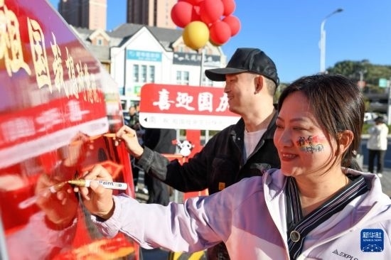 9月29日,烏魯木齊市水磨溝區(qū)水磨溝街道北山社區(qū)居民在心愿墻上寫(xiě)下對(duì)祖國(guó)的祝福。