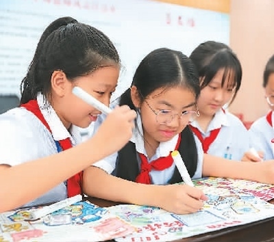 浙江省臺州市路橋區(qū)螺洋小學(xué)的學(xué)生繪制網(wǎng)絡(luò)安全宣傳手抄報。蔣友青攝(人民視覺)