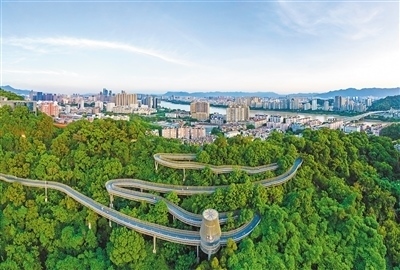生態(tài)道福建福州市在建設(shè)“福道”時,采取鋼結(jié)構(gòu)高架、鏤空橋面棧道、節(jié)點大跨度橋梁等創(chuàng)新設(shè)計,最大限度保護森林原生態(tài)。林雙偉攝(人民視覺)