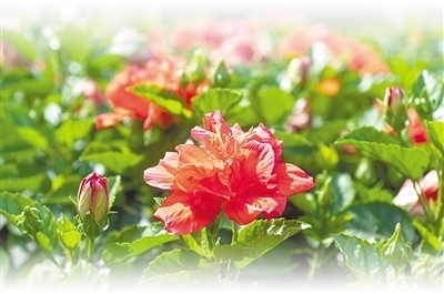 朱槿花大色艷,花蕊細(xì)長伸出于花瓣之外,花柱五裂,柱頭如粉球,花形俏麗喜慶,在我國兩廣地區(qū)被稱為“大紅花”,深受人們喜愛。在南寧,常見的朱槿花有十幾個品種,既有獨株高兩三米的小喬木、適合密植為樹籬的灌木,也有適合庭院、窗臺精巧布置的盆栽。