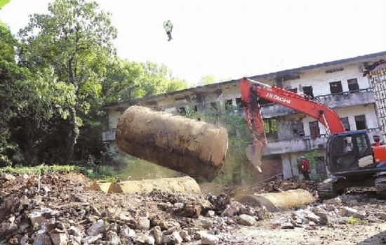 圖③:工作人員用挖掘機挖出油罐體。