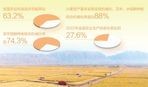 農(nóng)機(jī)為糧食生產(chǎn)護(hù)航,豐收更添底氣。目前,北斗導(dǎo)航大馬力拖拉機(jī)、氣力式高速精量播種機(jī)、乘坐式插秧機(jī)、植保無人機(jī)、玉米籽粒聯(lián)合收獲機(jī)等新型農(nóng)機(jī)廣泛應(yīng)用。全國農(nóng)業(yè)科技進(jìn)步貢獻(xiàn)率達(dá)63.2%,農(nóng)作物耕種收綜合機(jī)械化率達(dá)74.3%,小麥生產(chǎn)基本實(shí)現(xiàn)全程機(jī)械化,玉米、水稻耕種收綜合機(jī)械化率超過88%。