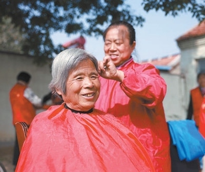 德化人心山東省東營市廣饒縣開展形式多樣的活動(dòng),弘揚(yáng)愛老敬老的優(yōu)良傳統(tǒng)。圖為在廣饒縣李鵲鎮(zhèn)趙寺村,志愿者為老人理發(fā)。劉云杰攝(影像中國)