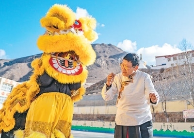 凝聚人心融合了漢藏特色表演形式的碩督鎮(zhèn)獅子舞,見證著西藏各民族交往交流交融的歷史。鄧巴阿尼是西藏昌都市非物質(zhì)文化遺產(chǎn)碩督鎮(zhèn)獅子舞的傳承人,近年來致力于獅子舞傳承。圖為鄧巴阿尼(右)在昌都市洛隆縣碩督鎮(zhèn)小學(xué)指導(dǎo)學(xué)生跳獅子舞。新華社記者 丁增尼達(dá)攝