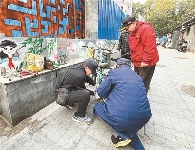 “幫把手公益服務(wù)隊(duì)”的于師傅(左二)為居民修理自行車。本報記者 霍旻含攝