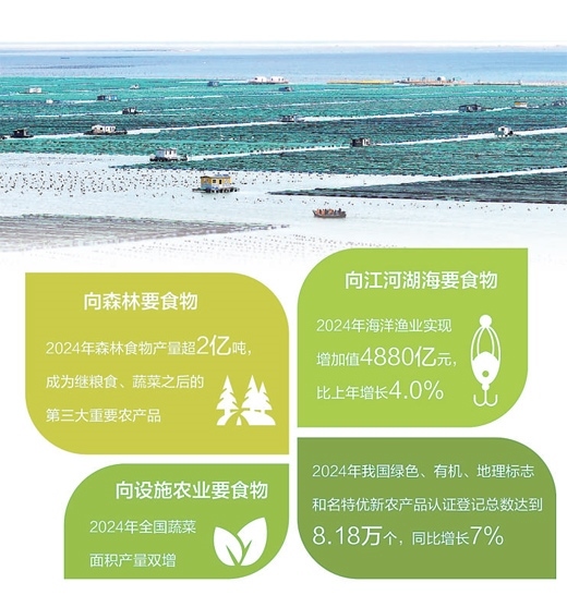 向森林要食物,2024年森林食物產(chǎn)量超2億噸,成為繼糧食、蔬菜之后的第三大重要農(nóng)產(chǎn)品。向江河湖海要食物,2024年海洋漁業(yè)實現(xiàn)增加值4880億元,比上年增長4.0%。向設(shè)施農(nóng)業(yè)要食物,2024年全國蔬菜面積產(chǎn)量雙增。