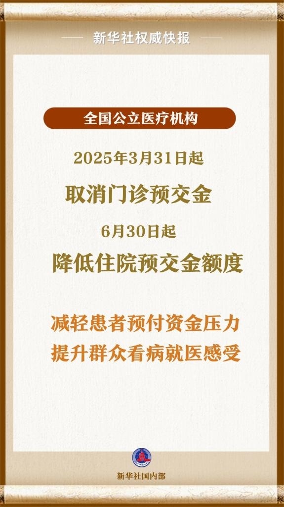 國(guó)家衛(wèi)生健康委、財(cái)政部、國(guó)家醫(yī)保局等6部門日前聯(lián)合印發(fā)《關(guān)于規(guī)范公立醫(yī)療機(jī)構(gòu)預(yù)交金管理工作的通知》,要求公立醫(yī)療機(jī)構(gòu)自2025年3月31日起全面停止收取門診預(yù)交金,自2025年6月30日起降低住院預(yù)交金額度。