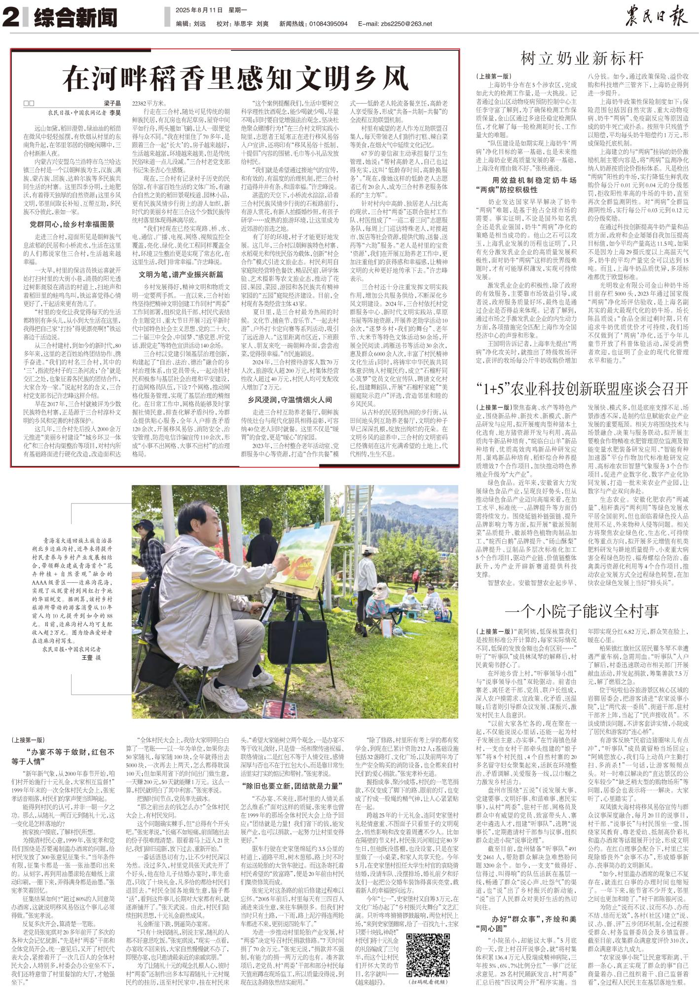 2025年8月11日,《農(nóng)民日報》第2版刊發(fā)題為《在河畔稻香里感知文明鄉(xiāng)風》的文章,報道了內(nèi)蒙古興安盟烏蘭浩特市烏蘭哈達鎮(zhèn)三合村是一個以朝鮮族為主,漢族、滿族、蒙古族、回族、達斡爾族等多民族共同生活的村寨。這里四季分明,土地肥沃,有著得天獨厚的自然資源;這里鄉(xiāng)風文明,鄰里間取長補短、互幫互助,多民族不分彼此,親如一家。